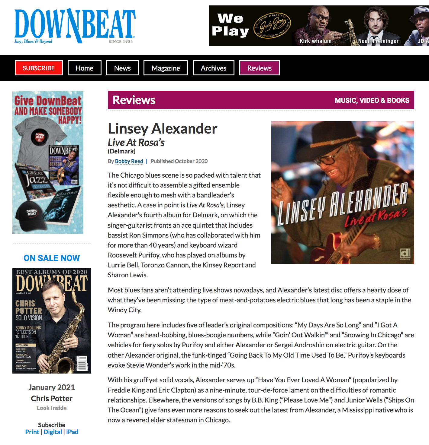 The Chicago blues scene is so packed with talent that it’s not difficult to assemble a gifted ensemble flexible enough to mesh with a bandleader’s aesthetic. A case in point is Live At Rosa’s, Linsey Alexander’s fourth album for Delmark, on which the singer-guitarist fronts an ace quintet that includes bassist Ron Simmons (who has collaborated with him for more than 40 years) and keyboard wizard Roosevelt Purifoy, who has played on albums by Lurrie Bell, Toronzo Cannon, the Kinsey Report and Sharon Lewis.