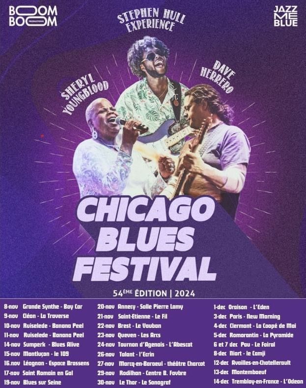 As has been the custom since 1969 (!), the Chicago Blues Festival tour will visit us at the end of 2024. Last year, it took us to different cities in the United States, to Seattle with Lady A, to Saint-Louis with Marquise Knox and to Jackson with Dexter Allen. Some people do not hesitate to criticize these choices of sets without Chicago artists. I find the trial a little futile. Indeed, even if the tour is called Chicago Blues Festival, this does not oblige it to select only bluesmen from the Windy City since it offers the European public the best in terms of American blues. The question does not arise for this edition which has selected artists from Chicago, namely singer-guitarist Stephen Hull (who certainly lives in Racine, Wisconsin, but the city is close to Chicago where he performs very regularly), singer-drummer Sheryl Youngblood ( my article of December 4, 2023 ) and singer-guitarist Dave Herrero. Here is now the list of 28 dates (including 25 in France!) in November and December 2024.