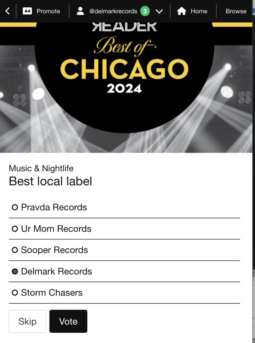 AwardsDelmark News BlogVote for DELMARK RECORDS and Delmark artists DAVE SPECTER, CARLISE GUY & NuBlu in annual CHICAGO READER Best of 2024 poll! Kevin Johnson11 months ago11 months ago01 mins mins VOTE HERE! https://chicagoreader.com/best-of-chicago-voting/ Special shout to Evanston SPACE, Riotfest, our Alderman Matt Martin, and all the local record stores and venues Post navigation Previous: SOUL BAG covers SHERYL YOUNGBLOOD on “Chicago Blues Festival” tour in France with Johnny Iguana, Stephen Hull, Dave Herrero!Next: BLUESDAY TUESDAY with MIKE WHEELER! Fantastic pics from Alan Frohlichstein Leave a Reply Cancel replyYour email address will not be published. Required fields are marked *Comment * Name * Email * Website Notify me of new posts by email. Δ