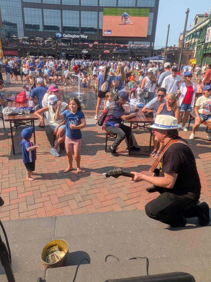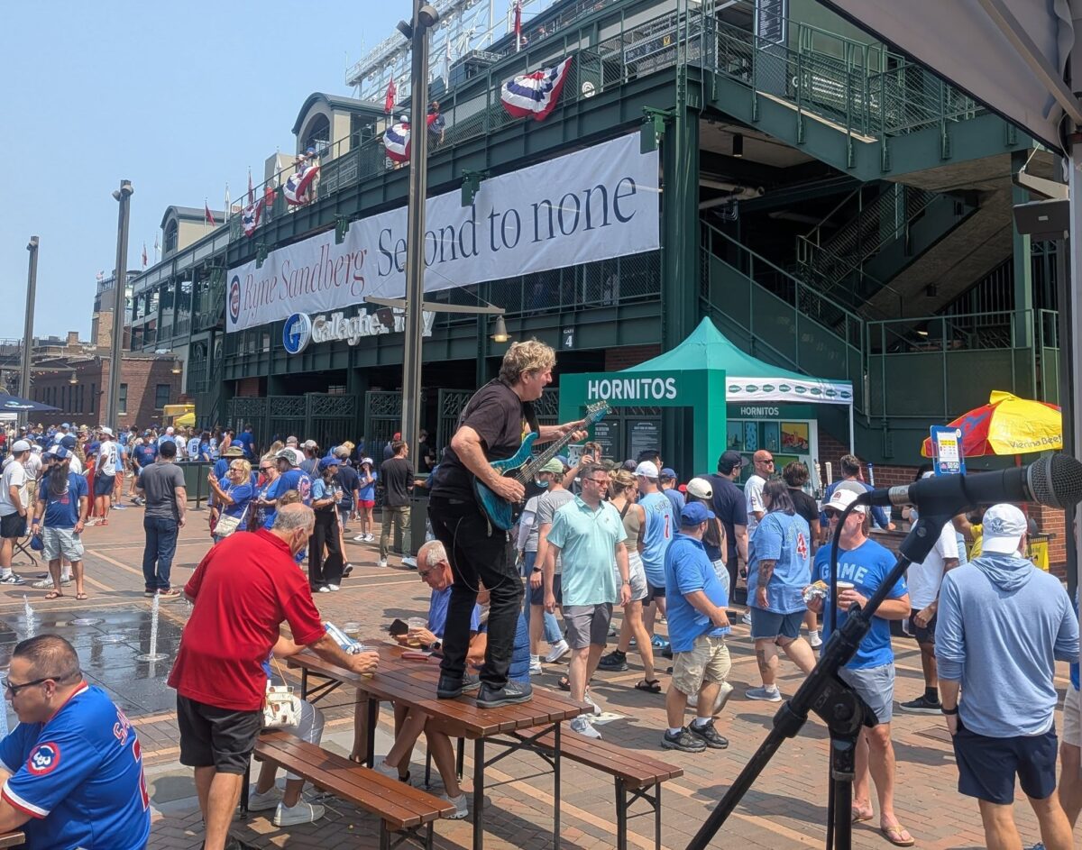 DAVE WELD loves to work the crowd- usually bar walkin’ & table toppin’ – here at Cubs’ Gallagher Way!