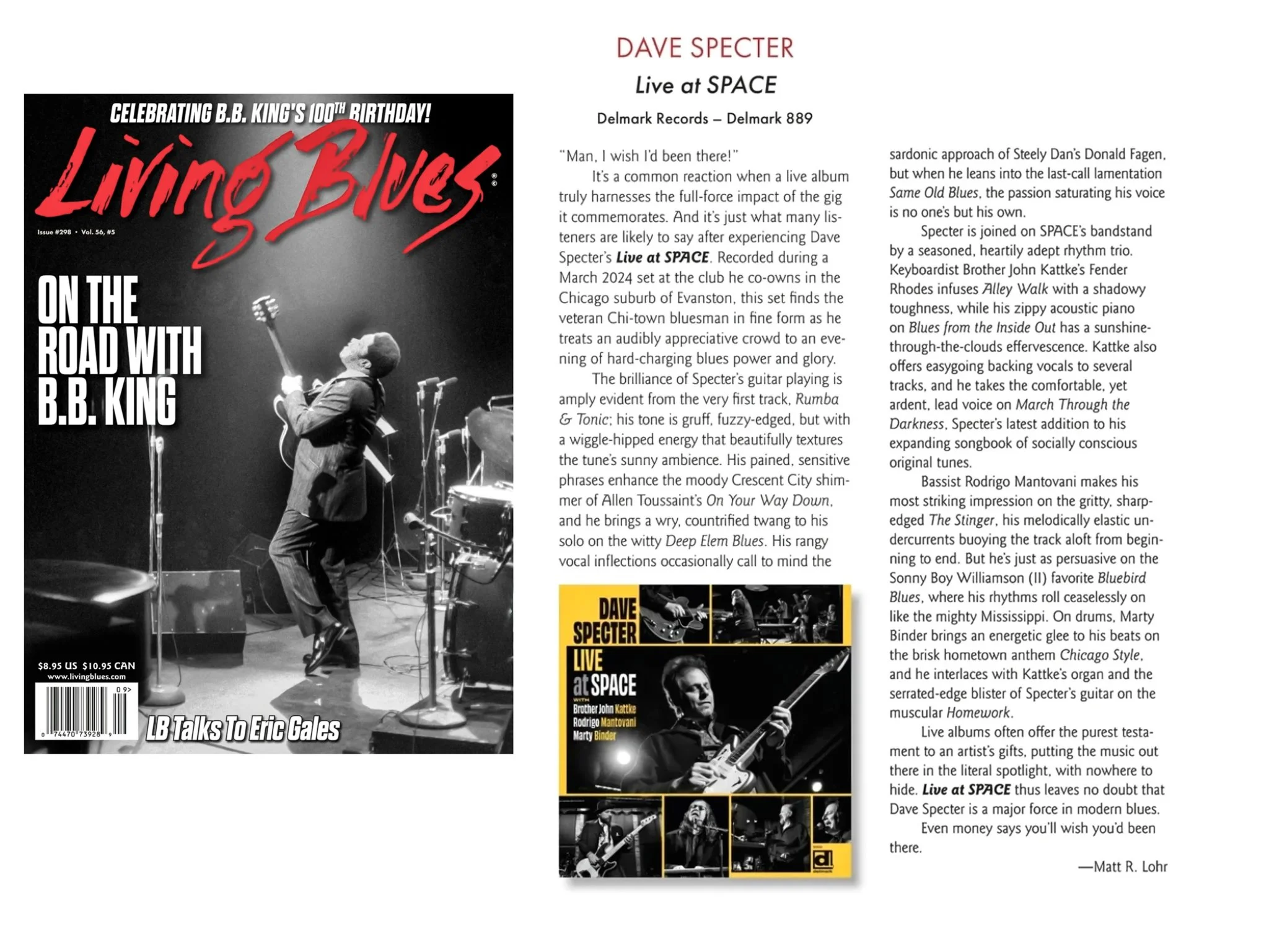 Chicago Blues Guide: “On his most recent Delmark release, his 13th for the label, Specter and his crack band (Brother John Kattke, Marty Binder and Rodrigo Mantovani) offer a set of tunes recorded at SPACE in Evanston IL which demonstrate why Dave Specter is among the pantheon of great modern blues musicians. Live At SPACE is a recording which captures Chicago’s finest blues musicians at one of Chicago’s best sounding venues”