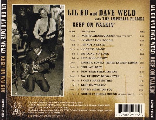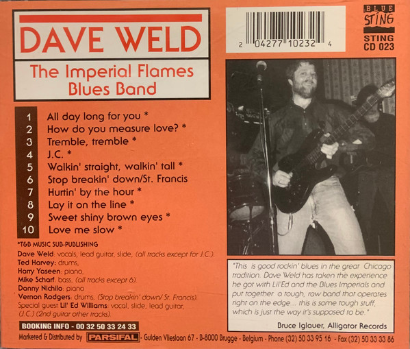 In 1988 Dave decided to start his own band “Dave Weld and the Imperial Flames” first releasomg in 1988′ “Rough Rockin in Chicago” on Blue Sting Records. This band featured the most authenic seasoned blues veterans in Chicago. Such as Bernard Reed, Bass Guitar, Leo Davis, Piano, Daryl Mahon, Drums, Donny Nichilo, Piano, Mike Scharf, Bass Guitar, Vernon Rogers, Drums and Ted Harvey, Drums. They toured countless times around the world, local and national festivals and the best venues in the Midwest and the national. In 1996, Weld was joined by Lil Ed and together the Imperial Flames released their sophomore album “Keep On Walkin” on the Earwig label. Lil Ed rejoined Dave’s band twice for two years each time and the second time they recorded for Earwig Music, “Keep on Walkin'”, and this brought them overseas again, as well as local, regional, and national gigs. When Ed went back to his band he was replaced by the great Abb Locke, legendary sax man. They continued working every week since the band was formed and Dave made his first UK tour in 2005, with the second to closing slot at the Maryport Blues Festival, going full circle by opening up for Hubert Sumlin and the Legendary Blues Band!