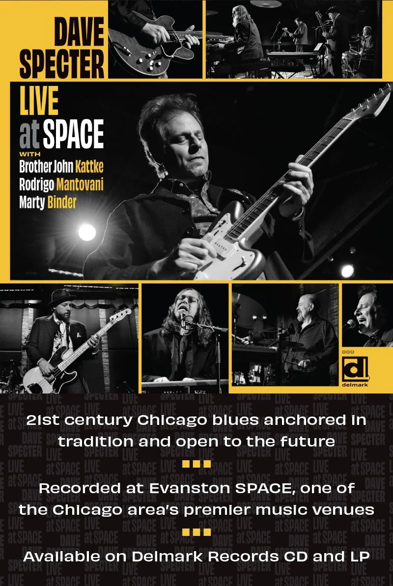 Chicago Blues Guide:On his most recent Delmark release, his 13th for the label, Specter and his crack band (Brother John Kattke, Marty Binder and Rodrigo Mantovani)  offer a set of tunes recorded at SPACE in Evanston IL which demonstrate why Dave Specter is among the pantheon of  great modern blues musicians. Live At SPACE is a recording which captures Chicago’s finest blues musicians at one of Chicago’s best sounding venues”